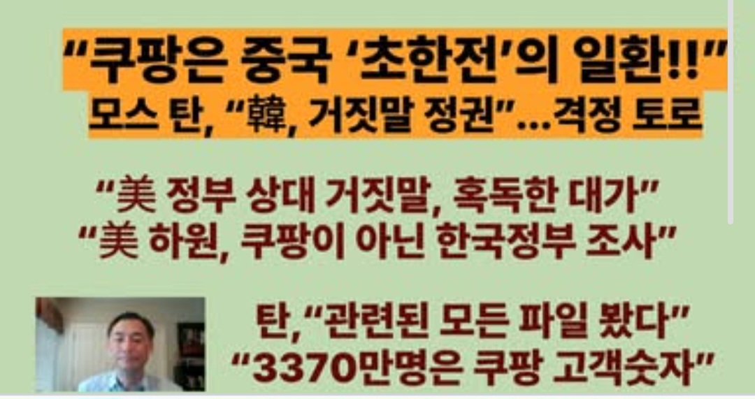 ■모스 탄, “韓, 거짓말 정권”...격정 토로 /“쿠팡은 중국 ‘초한전’의 일환” /10여 건의 한국 정부 차원 공격 / “관련된 모든 파일 봤다”