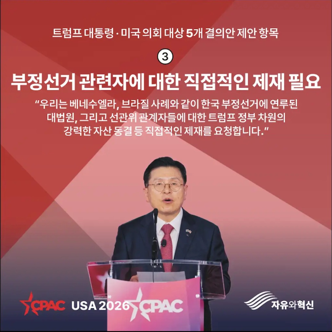 이날 연설에서 황 대표는 이러한 상황을 뒤집기 위한 다섯 가지 요구안도 제시했다. 우선 미 의회의 윤석열 대통령 석방 결의안 채택을 요청하며 “반국가 세력과 중국 공산당의 공작으로 탄핵, 구금된 대통령의 즉각적인 석방을 촉구한다”고 말했다. 이어 ‘사이버 선거 시스템 해킹에 대한 즉각적인 개입’을 제시하며 “중국 공산당의 한국 선거 개입을 한미동맹에 대한 직접적인 침공으로 간주하고 개입을 요청한다”고 밝혔다.
