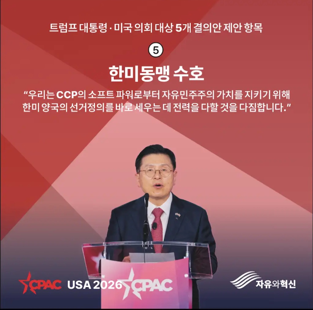 지난 25~28일 미국 텍사스주에서 보수진영의 연례 최대 규모 행사인 ‘보수정치행동회의(CPAC) 2026’가 열린 가운데, 행사 셋째날인 27일 황 대표가 연사 자격으로 무대에 올랐다.