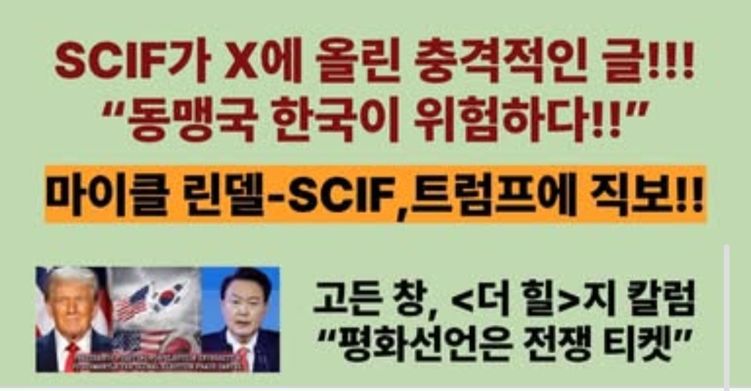 ■SCIF(스키프)가 X에 올린 충격적인 글, “동맹국 한국이 너무너무 위험하다” / 마이클 린델-SCIF, 트럼프에 직보 / 고든 창, '더 힐'지 기고...“평화선언은 전쟁 티켓”