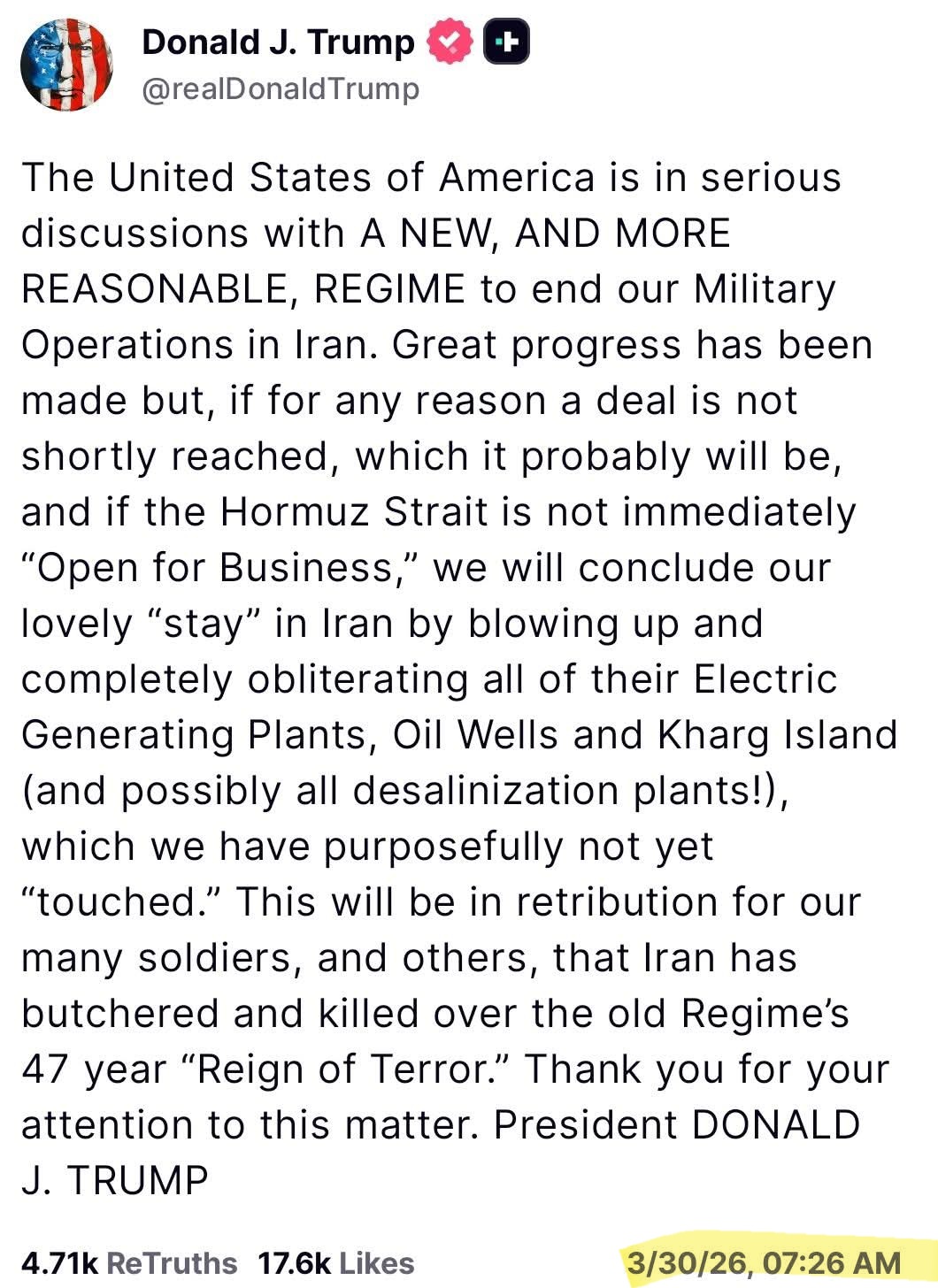트럼프 대통령은 “어떤 이유로든 신속히 합의가 이뤄지지 않거나 호르무즈 해협이 즉시 개방되지 않는다면, 우리는 이란의 모든 발전소와 유정, 하르그 섬을 완전히 폭파하고 파괴하는 것으로 우리의 이란 ‘체류’를 마무리할 것”이라고 밝혔다.