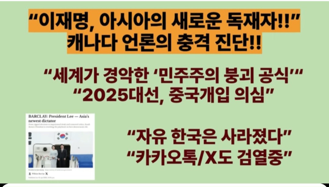 ■캐나다 언론의 충격 진단!! “이재명 자체가 민주주의에 대한 위협”, “파시즘의 매개체, 한국 파멸로 몰아가”, “윤석열 투옥은 파시즘의 시작”
