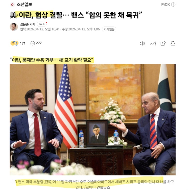 | ■밴스 부통령, 종전 협상 결렬 발표…“이란, 21시간 협상 끝에 미국의 평화 조건 거부” (0) | 2026.04.12 |
