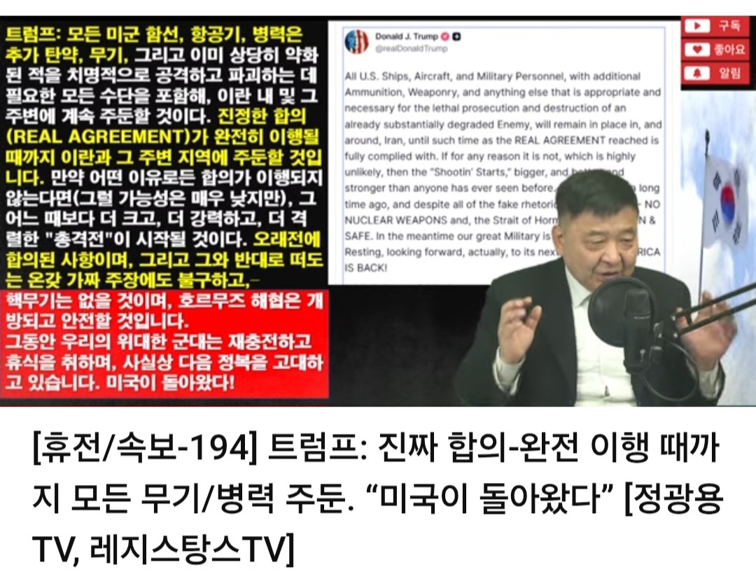 오래전에 이미 합의된 바와 같이, 그 반대되는 모든 가짜 수사(rhetoric)에도 불구하고 핵무기는 절대 안 되며, 호르무즈 해협은 개방되고 안전하게 유지될 것입니다. 그동안 우리의 위대한 군대는 다음 정복을 기대하며 물자를 채우고 휴식을 취하고 있습니다. 미국이 돌아왔습니다!
