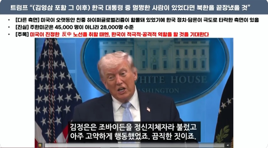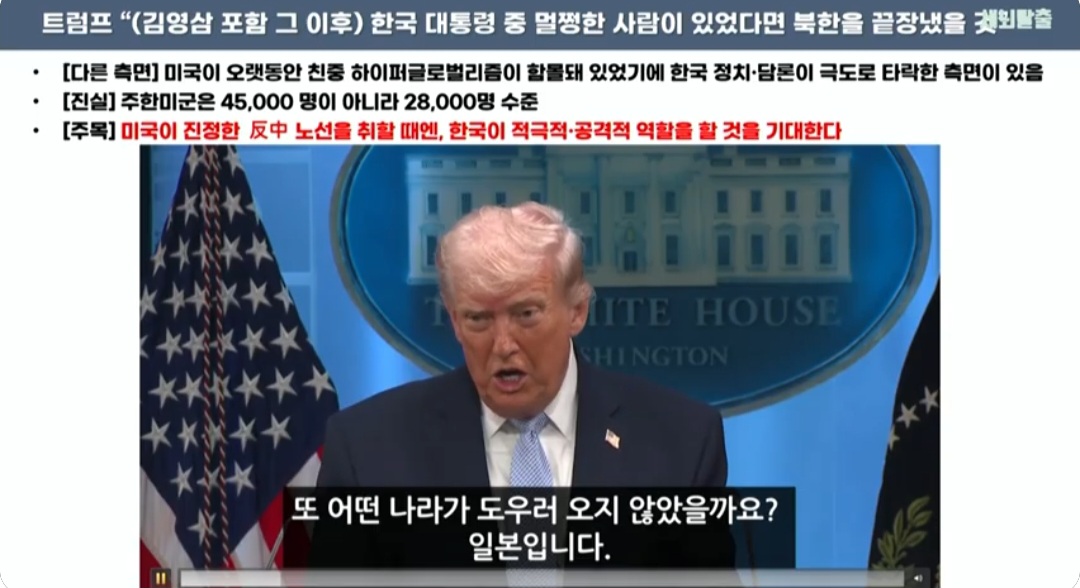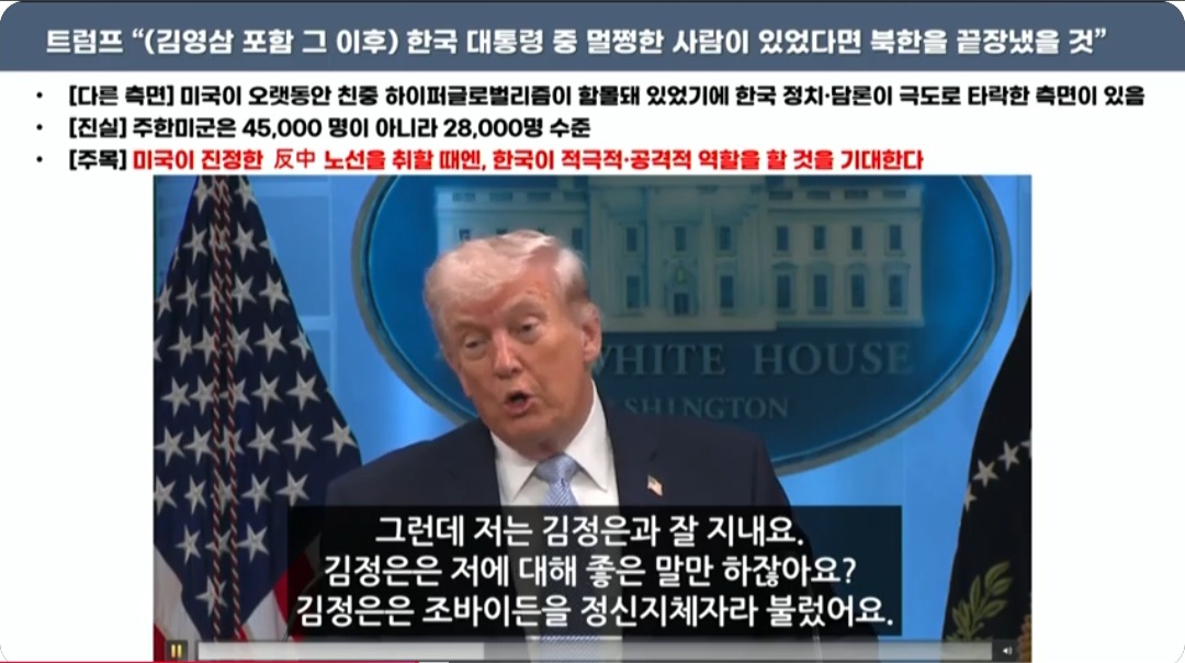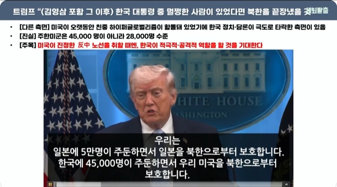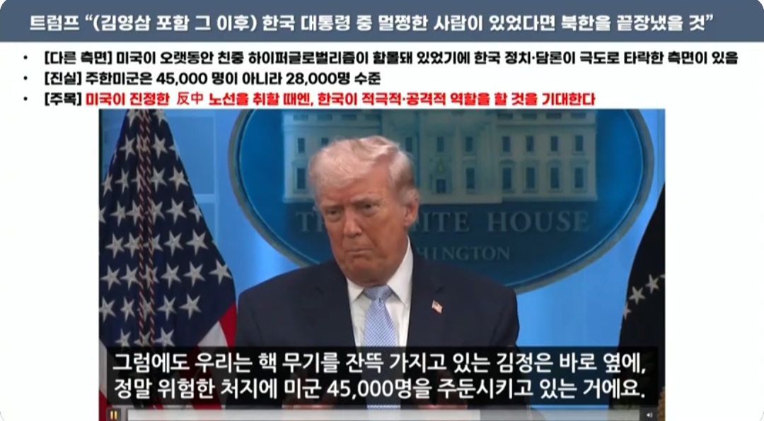 트럼프는 주한미군과 관련해 매우 정치적인 화법을 사용하며, 한국이 스스로 안보 능력을 갖추고 북한을 견제할 것을 은연중에 압박하고 있습니다(12:53-16:48). 미국은 한국이 더 이상 중국에 의존하거나 눈치를 보지 말고, 전략적 자산을 활용해 북한을 억제하는 독자적인 태도를 취하기를 바라고 있습니다(16:29-16:48).