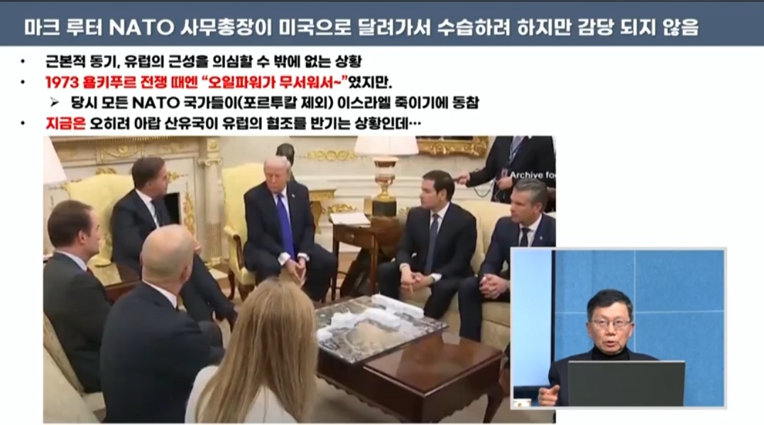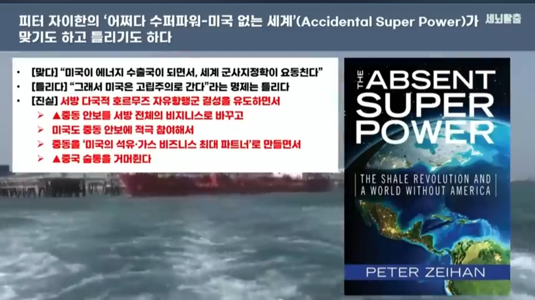 현재 미국은 중동 내 우호적 아랍국가들과 이스라엘, 그리고 친미로 돌아선 이란 세력을 연결해 '다국적 호르무즈 자유항행군'과 같은 새로운 명분을 만들려 합니다(29:53-30:45). 이는 중동 에너지 질서를 재편함과 동시에, 중국을 고립시키기 위한 거대한 지정학적 설계의 일환입니다(35:35-35:44).