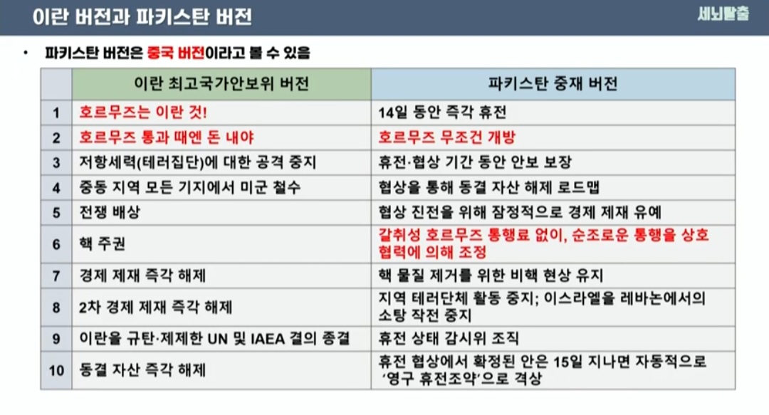 트럼프 행정부는 이란의 봉쇄 시도에 대응하여 호르무즈 작전을 감행할 의지가 있습니다(0:29-0:38). 이는 단순히 동맹국(유럽, 한국, 일본)의 에너지 공급을 위해서가 아니라, 중동을 영향권 아래 확보하고 중국의 숨통을 조이기 위한 전략적 포석으로 풀이됩니다(0:34-0:39). 트럼프가 언급한 '십계항'은 이란의 요구가 아닌 파키스탄이 중재한 버전이며, 이란의 호르무즈 봉쇄 포기와 핵물질 제거를 골자로 합니다(3:35-4:58).