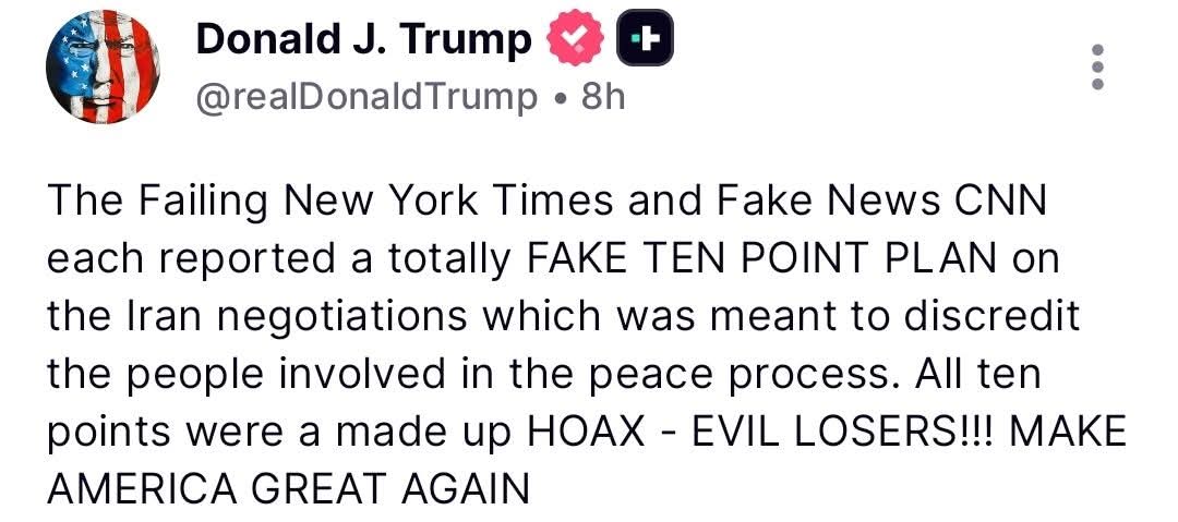 망해가는 뉴욕 타임스와 가짜 뉴스 CNN은 각각 이란 협상에 관한 완전히 조작된 ‘10개 조항 계획’을 보도했는데, 이는 평화 프로세스에 관여한 인사들의 신뢰를 떨어뜨리려는 의도였습니다. 그 10가지 항목은 모두 지어낸 뻥(*HOAX)이었습니다. 사악한 찌질이들!!! MAKE AMERICA GREAT AGAIN