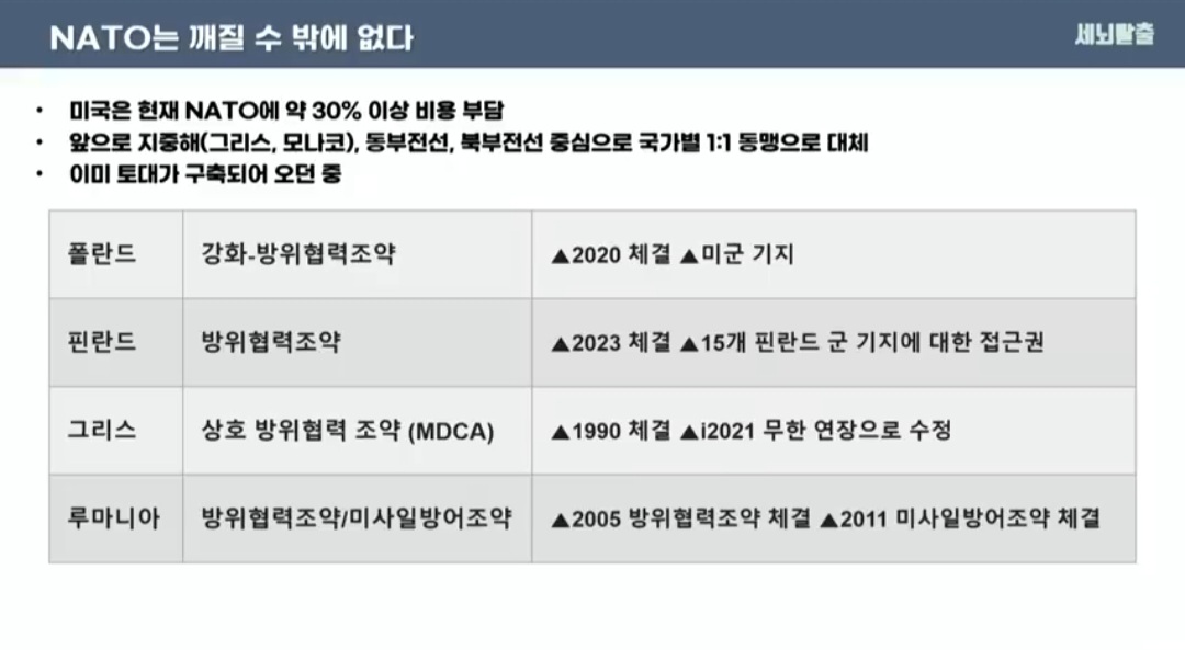 유럽 국가들이 미국의 작전을 방해하고 영공 사용을 거부하는 등 비협조적인 태도를 보임에 따라 나토는 사실상 깨졌다고 평가합니다(17:34-18:02). 미국은 기존의 집단 방위 체제 대신, 폴란드, 핀란드, 그리스 등과 개별적인 일대일 동맹을 강화하며 러시아 및 중국을 견제하는 새로운 안보 지도를 그리고 있습니다(21:30-23:05).
